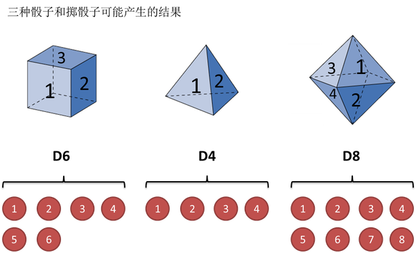 假设我手里有三个不同的骰子:第一个骰子是我们平常见的骰子,6 个面(1,2,3,4,5,6),每个面出现的概率是 1/6,记为 D6。第二个骰子是个四面体(1,2,3,4),每个面出现的概率是 1/4,记为 D4。第三个骰子有八个面(1,2,3,4,5,6,7,8),每个面出现的概率是 1/8,记为 D8。如下图所示: