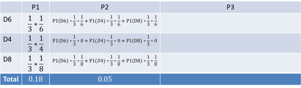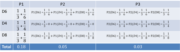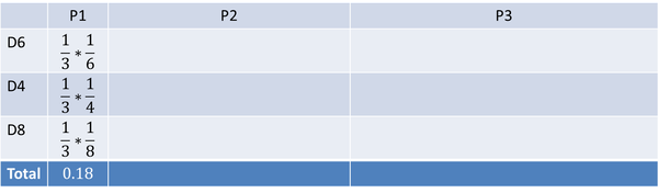 结果为 (1,6),同样的,我们要计算第二个骰子是 D6、D4、D8 的最大概率。第二个骰子取到 D6 的最大概率是: