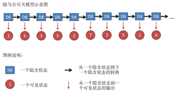假设我们开始掷骰子,我们先从三个骰子里挑一个,挑到每一个骰子的概率都是 1/3。然后我们掷骰子,得到 1、2、3、4、5、6、7、8 中的一个数字。不停的重复上述过程,我们会得到一串数字,例如 1 6 3 5 2 7 3 5 2 4 (掷骰子 10 次)。这串数字叫做可见状态链。但是在隐马尔可夫模型中,我们不仅仅有这么一串可见状态链,还有一串隐含状态链。在这个例子里,这串隐含状态链就是你用的骰子的序列,比如:D6 D8 D8 D6 D4 D8 D6 D6 D4 D8。