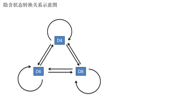 一般来说,HMM 中说到的马尔可夫链其实是指隐含状态链,因为隐含状态(骰子)之间存在转换概率(transition probability)。在我们这个例子里,D6 的下一个状态是 D4、D6、D8 的概率都是 1/3。D4、D8 下一个状态是 D4、D6、D8 的转换概率也都一样是 1/3。但是我们其实是可以随意设定转换概率的,比如,我们可以定义:D6 后面不能接 D4,D6 后面是 D6 的概率是 0.9,是 D8 的概率是 0.1,这样就是一个新的 HMM。
