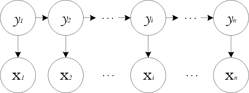 其中 $y_t\in{s_1,s_2,\cdots,s_N}$ 和 $x_t\in{o_1,o_2,\cdots,o_M}$ 分别为第 $t$ 时刻的状态和观测值。