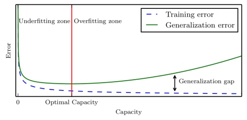 通常,当模型容量上升时,训练误差会下降,直到渐近最小可能误差。通常,泛化误差是一个关于模型容量的 U 形曲线函数。如下图所示。