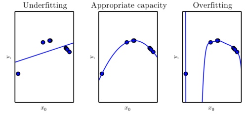 我们可以通过调整模型的容量 (capacity) 来控制模型是否偏向于过拟合或者欠拟合。通俗地,模型的容量是指其拟合各种函数的能力。容量低的模型可能很难拟合训练集。容量高的模型可能会过拟合,因为记住了不适用于测试集的训练集性质。
