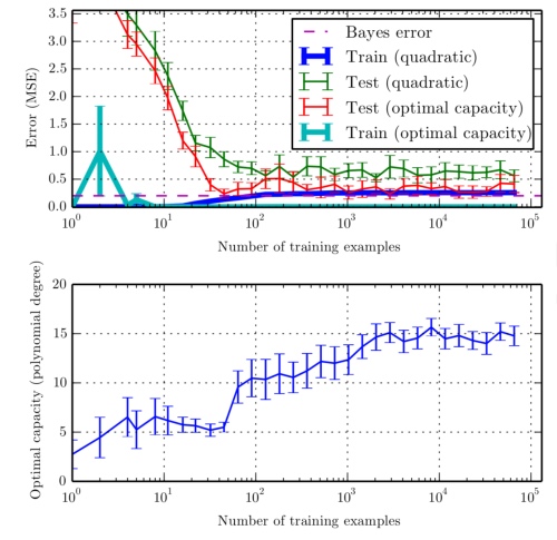 - 下:当训练集大小增大时,最佳容量(在这里是用最优多项式回归器的阶数衡量的)也会随之增大。最佳容量在达到足够捕捉模型复杂度之后就不再增长了。