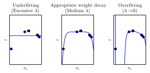 - 左:当 $\lambda$ 非常大时,我们可以强迫模型学习到了一个没有斜率的函数。由于它只能表示一个常数函数,所以会导致欠拟合。