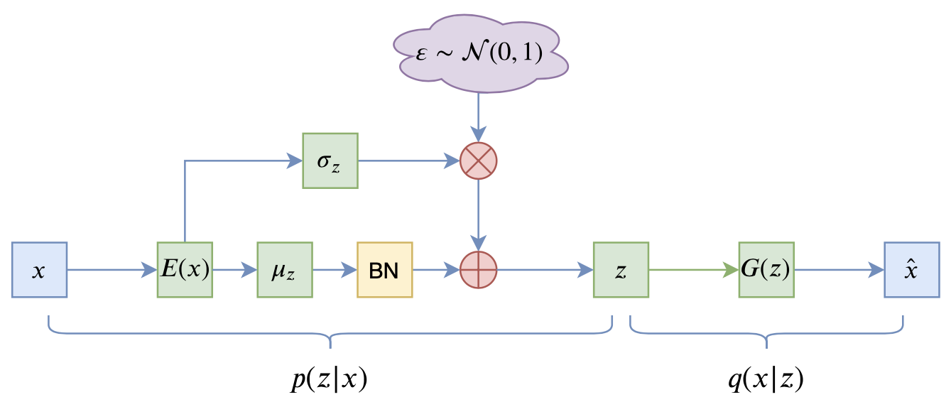 \[\begin{equation}\mathbb{E}_{x\sim\tilde{p}(x)}\left[KL\big(p(z|x)\big\Vert q(z)\big)\right] \geq \frac{1}{b} \sum_{i=1}^b \sum_{j=1}^d \frac{1}{2}\mu_{i,j}^2 = \frac{1}{2}\sum_{j=1}^d \left(\frac{1}{b} \sum_{i=1}^b \mu_{i,j}^2\right)\label{eq:kl}\end{equation} \tag{11}\]留意到括号里边的量,其实它就是 $\mu$ 在 batch 内的二阶矩,如果我们往 $\mu$ 加入 BN 层,那么大体上可以保证 $\mu$ 的均值为 $\beta$,方差为 $\gamma^2$($\beta,\gamma$ 是 BN 里边的可训练参数),这时候
