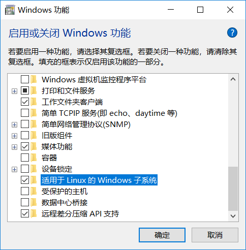 首先在“开始”菜单边上的搜索栏中键入“启用或关闭 windows 功能”,下拉并勾选“适用于 Linux 的 Windows 子系统”,生效需要重启系统。