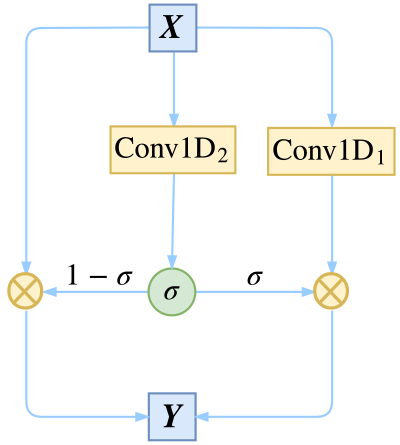 \[\boldsymbol{Y}=\boldsymbol{X} + \text{Conv1D}_1(\boldsymbol{X}) \otimes \sigma\Big(\text{Conv1D}_2(\boldsymbol{X})\Big)\tag{2}\]值得一提的是,我们使用残差结构,并不只是为了解决梯度消失,而是使得信息能够在多通道传输。我们可以将上式改写为更形象的等价形式,以便我们更清晰看到信息是如何流动的:
