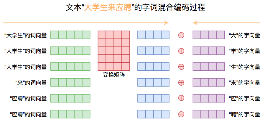 - 输入字 id 序列,然后通过字词混合 Embedding(具体的混合方式后面再介绍)得到对应的字向量序列,然后加上 Position Embedding;