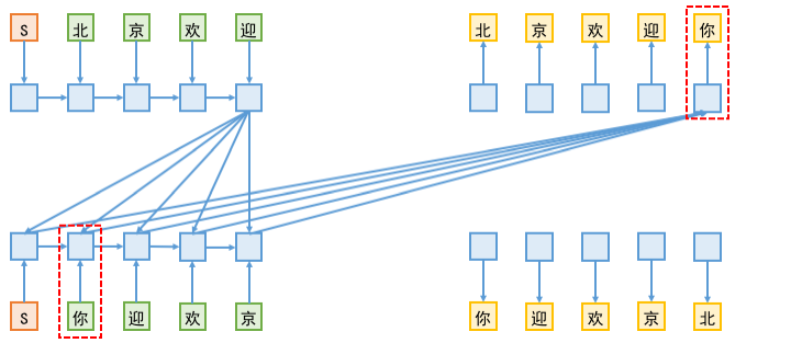 下面是笔者给出了双向解码的参考实现,跟之前 Keras 参考一节一致,只是解码端从双向换成单向了:https://github.com/bojone/seq2seq/blob/master/seq2seq_bidecoder.py