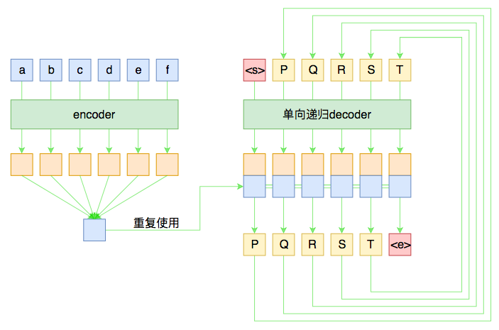 假如原句子为 $X=(a,b,c,d,e,f)$,目标输出为 $Y=(P,Q,R,S,T)$,那么一个基本的 seq2seq 就如下图所示。