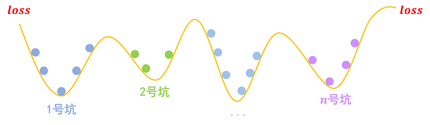 事实上,关于梯度惩罚,我们有一个非常直观的几何图像。以常规的分类问题为例,假设有 $n$ 个类别,那么模型相当于挖了 $n$ 个坑,然后让同类的样本放到同一个坑里边去: