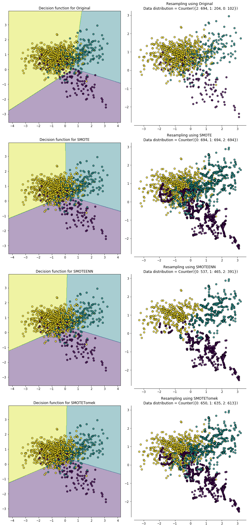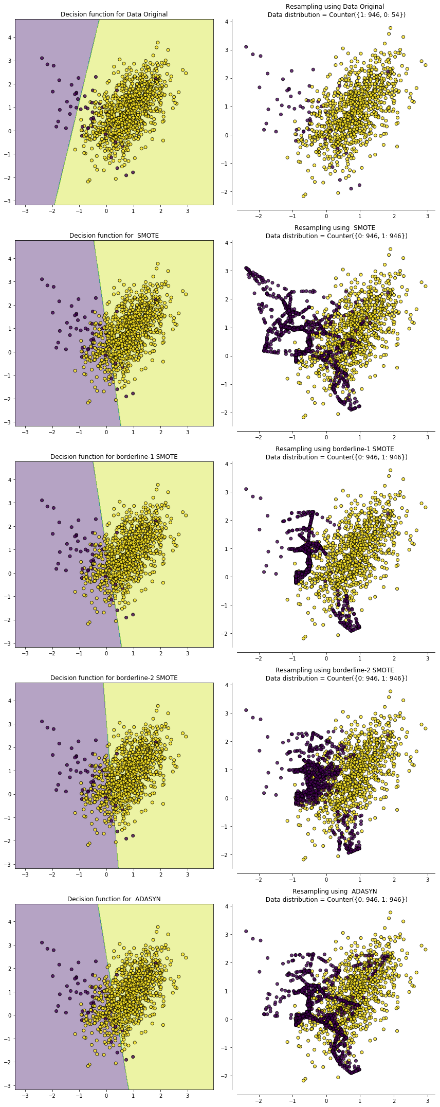 为了直观地比较上面介绍的各种过采样法的效果,我们首先利用 sklearn中的 make_classification 构造了一个不平衡数据集,各类别比例为 ${0:54, 1:946}$。然后分别对这个数据集进行 SMOTEB、Borderline-1 SMOTEB、orderline-2 SMOTE 和 ADASYN 过采样结果如下图所示,左侧为过采样后的决策边界,右侧为过采样后的样本分布情况。