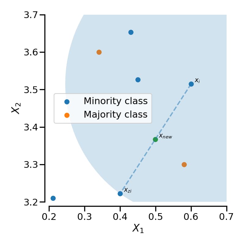 \[\boldsymbol{x}_{new} = \boldsymbol{x}_i + (\hat{\boldsymbol{x}}_i - \boldsymbol{x}_i)\times \delta \tag{4}\]其中 $\hat{\boldsymbol{x}}$ 为选出的 $K$ 近邻点,$\delta \in [0,1]$ 是一个随机数。下图就是一个 SMOTE 生成样本的例子,使用的是 3-近邻,可以看出 SMOTE 生成的样本一般就在 $\boldsymbol{x}_i$ 和 $\hat{\boldsymbol{x}}_i$ 相连的直线上: