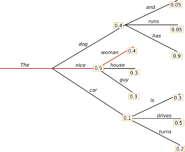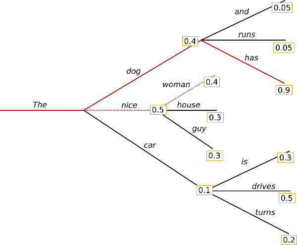 贪心搜索最大的问题是由于每次都只选择当前概率最大的词,相当于是区部最优解,因此生成的序列往往并不是全局最优的。例如在上图中,词语序列 (“The”, “dog”, “has”) 的概率是 $0.4 \times 0.9 = 0.36$,而这个序列无法通过贪心算法得到。