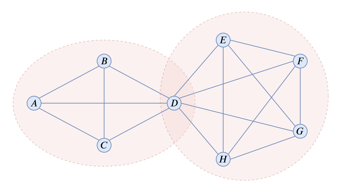 以上图为例,可以找出 $B$、$E$ 是一对不相邻节点,那么我们可以分别找出其相邻集为 ${A,B,C,D}$ 和${D,E,F,G,H}$,然后继续找 ${A,B,C,D}$ 和 ${D,E,F,G,H}$ 的不相邻节点对,发现找不到,所以 ${A,B,C,D}$ 和 ${D,E,F,G,H}$ 都是完全子图。