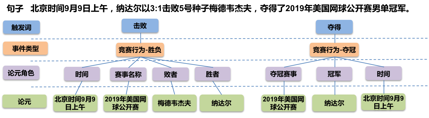 每个事件会有一个事件类型以及相应的触发词,并且配有不同角色的论元。其中,事件类型和论元角色是在约定的有限集合 (schema) 中选择,触发词和论元则是输入句子的片段。