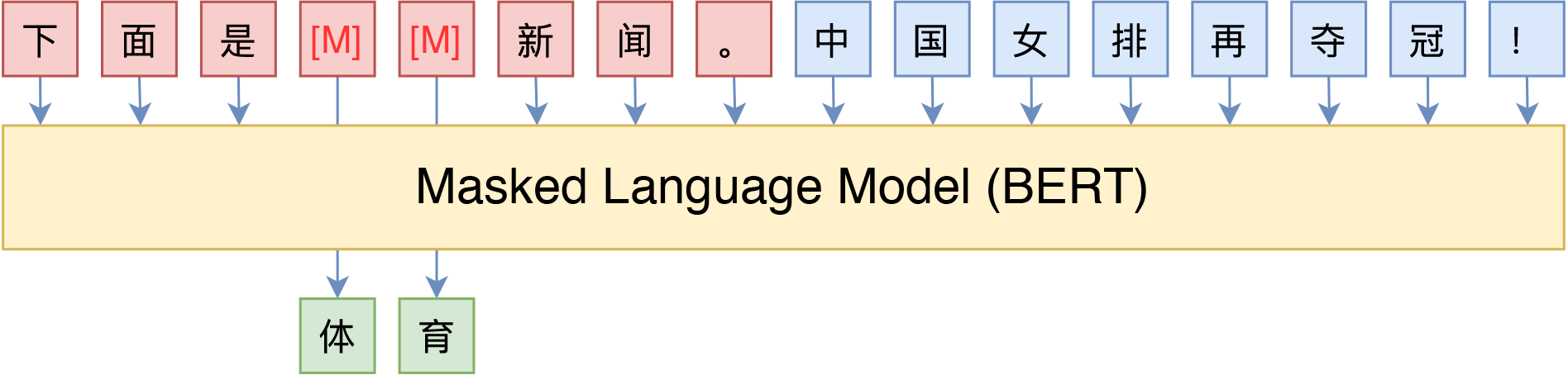 但是,这种使用方式存在着一个明显的问题:对 PLM 参数的微调过程与其预训练时存在明显差异。例如,大部分 PLM 都通过 Mask Language Model (MLM) 任务进行预训练,其每次随机地遮盖掉句子中的一些词(将这些词替换为 $\texttt{[MASK]}$ token),然后要求模型预测出被遮盖的词。然而,我们在使用 PLM 时,却只通过一些 token 甚至只通过 $\texttt{[CLS]}$ token 来建立 PLM 与最终任务之间的联系。换句话说,我们实际使用 PLM 时只是利用其对文本进行编码,与其预训练时进行的 MLM 等任务完全不同。