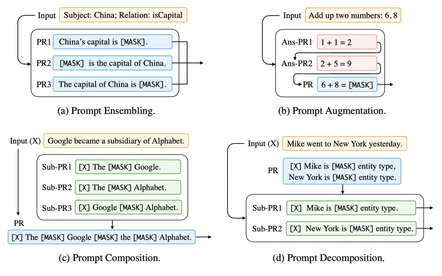 模板集成 (Prompt Ensembling):使用多个 Prompt 共同对输入进行预测,如图 (a) 所示。相比单模板方法,模板集成可以利用不同 prompt 的互补优势;减轻构建模板的成本,毕竟要选出性能最优 prompt 非常困难;缓解对模板的依赖,使得性能更稳定。