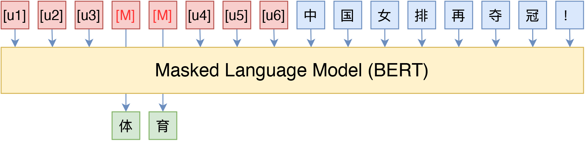 这里的 $\texttt{[u1]}$~$\texttt{[u6]}$ 代表 BERT 词表里边的 $\texttt{[unused1]}$~$\texttt{[unused6]}$,也就是使用几个从未见过的 token 来构成模板,token 的数目和位置都是超参数。然后,为了让模版发挥作用,我们用标注数据来调整这些特殊 token 的 Embedding。