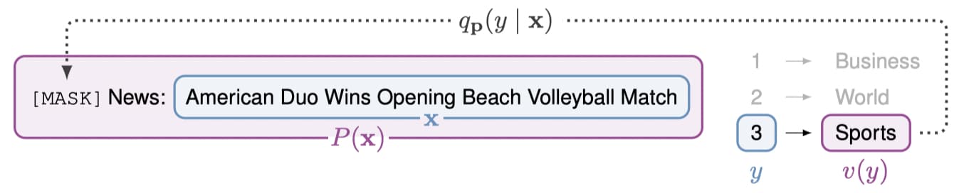 因此,输入 $X$ 为类别标签 $Y$ 的概率,就是给定对应模板 $P(\textbf{x})$ 中 $\texttt{[MASK]}$ token 为对应表意词 $v_y$ 的概率: