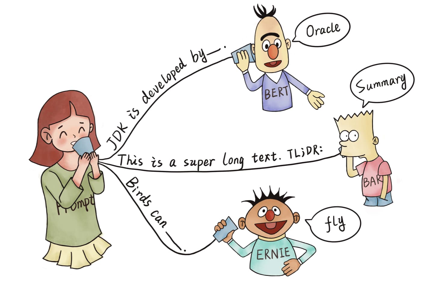 Prompt 方法的核心就是通过某个模板将要解决的问题转换到与 PLM 预训练任务类似的形式来进行处理。例如对于文本“I missed the bus today.”,我们可以通过构建模板“I missed the bus today. I felt so $\texttt{[MASK]}$”并使用遮盖语言模型 MLM (Masked Language Model) 预测情绪词来识别它的情感极性,也可以通过构建前缀“English: I missed the bus today. Chinese: $\texttt{[MASK]}$” 然后使用生成模型来获取它对应的中文翻译。