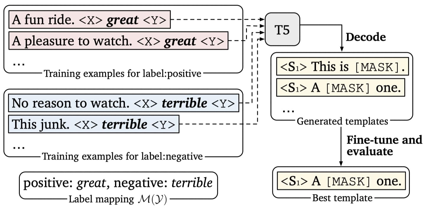 \[\textbf{x} \rightarrow \texttt{[MASK]}_1 v_y \texttt{[MASK]}_2 \textbf{x} \\ \textbf{x} \rightarrow \textbf{x} \texttt{[MASK]}_1 v_y \texttt{[MASK]}_2 \\ \textbf{x}_1,\textbf{x}_2 \rightarrow \textbf{x}_1 \texttt{[MASK]}_1 v_y \texttt{[MASK]}_2 \textbf{x}_2\]其中,$\texttt{[MASK]}_1,\texttt{[MASK]}_2$ 是 T5 可以进行解码的特殊 token,用来生成模板 token,$v_y$ 是对应的表意词。由于 T5 可以在一个 mask 位置解码出多个 token,因此也不需要预先指定模板 token 的数量。对于每个输入 $\textbf{x}$,Gao et al. (2021) 都先通过 T5 生成一些候选 Pattern,最终通过验证集上的性能来选择最优 Pattern,如下图所示: