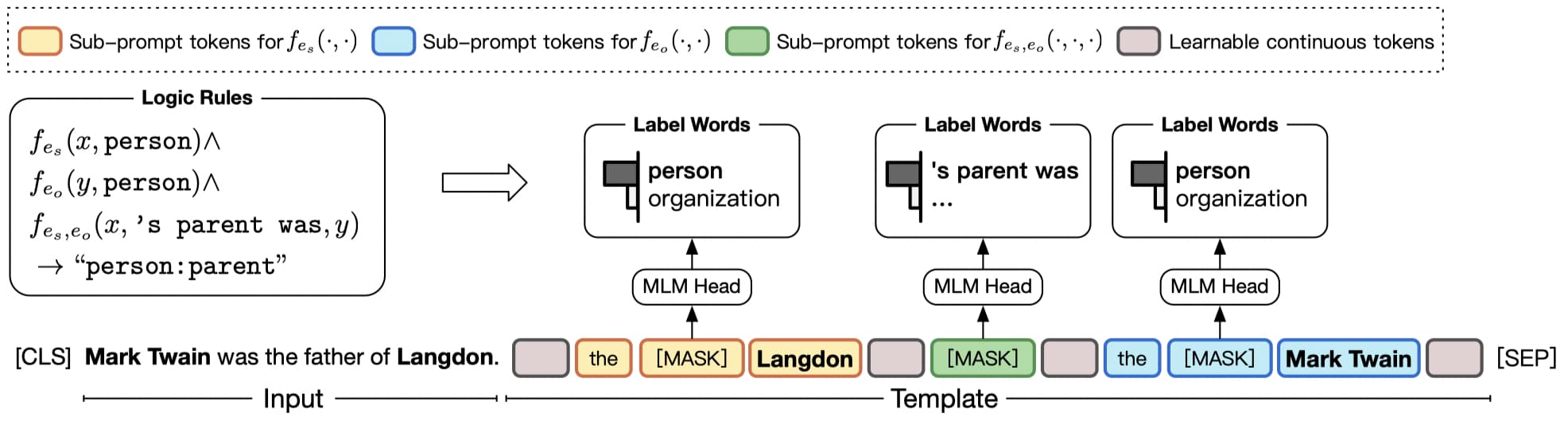 代表性的工作有 PTR (Han et al., 2021),把实体关系抽取拆分为“实体识别”和“关系分类”两个子任务,分别为这两个任务手工设计模板,然后根据逻辑规则将它们组合成一个完整的 Prompt。例如 PTR 把“person:parent”关系拆分成三个条件函数:
